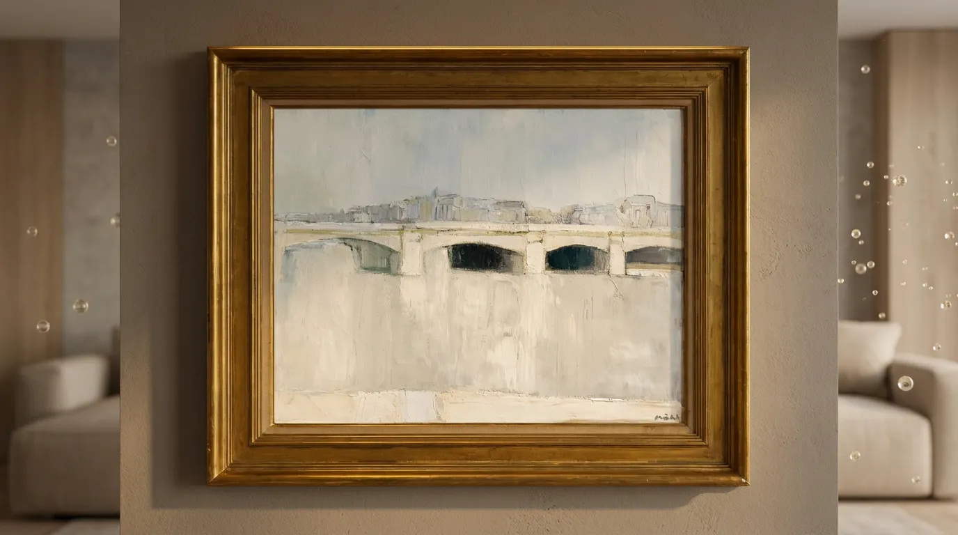 A refined and atmospheric Parisian view by Roger Muhl, depicting the bridge over the Seine near the Institut de France. Painted in 1963, the composition captures the quiet elegance of the river through a subtle palette of soft greys, ivory, and muted blues.